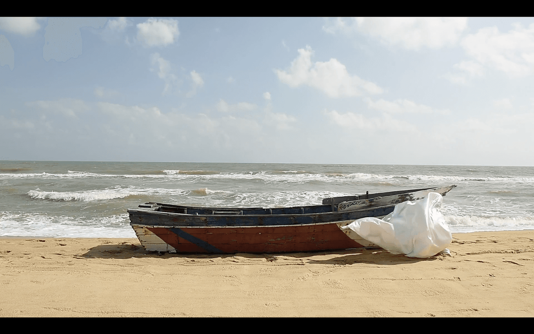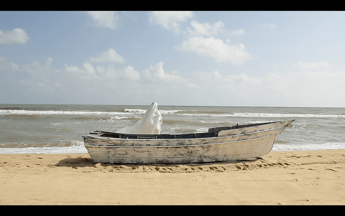 ภาพเปิดของวิดีโอเผยให้เห็นภูมิทัศน์ที่แทบปราศจากร่องรอยอารยธรรม ผืนทรายทอดตัวไปสู่เส้นขอบฟ้า ทะเลและท้องฟ้าหลอมรวมกันจนแยกขอบเขตได้ยาก ไม่มีสัญลักษณ์ของรัฐ เมือง หรือพรมแดนใดปรากฏ มีเพียงเรือลำหนึ่งทอดร่างสงัดท่ามกลางเสียงคลื่นลม มันมิได้แล่นอยู่กลางทะเลหากตั้งนิ่งอยู่บนผืนทราย ราวกับการเดินทางถูกพักไว้โดยไม่รู้กำหนด เรือในสภาพนี้มิใช่พาหนะ หากเป็นสัญลักษณ์ของการเดินทางที่ค้างคาของการอพยพที่ยังไม่เริ่มต้นหรืออาจไม่มีวันเกิดขึ้นจริง ภาพเคลื่อนไหวช่วงแรกของวิดิโอถูกวางไว้ในจังหวะนิ่งยาว กล้องแทบไม่เคลื่อนไหวราวกับปฏิเสธความเร่งรีบของโลกภายนอกคล้ายกับต้องการผู้ชมต้องเผชิญหน้ากับความรู้สึกบางประการเสียก่อน