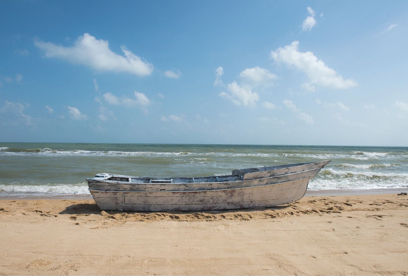 ไม่นานนัก หญิงสาวในชุดมุสลิมสีขาวค่อย ๆ ปรากฏขึ้น การมาถึงของเธอไม่ใช่การเข้าสู่ฉากอย่างฉับพลัน หากเป็นการซึมเข้าสู่ภาพราวกับร่างกายกำลังก่อตัวขึ้นจากภูมิทัศน์ เธอเดินเข้ามาช้า ๆ คล้ายผู้เดินทางที่ผ่านระยะทางยาวไกลเกินกว่าจะบอกเล่า จังหวะก้าวเท้าเนิบช้าสร้างความรู้สึกของ “การเคลื่อนที่โดยไร้การมาถึง” ทำให้ผู้ชมรู้สึกว่าเธอกำลังดำรงอยู่ในกระบวนการเดินทางที่ต่อเนื่องมาตลอดเวลา หญิงสาวค่อย ๆ เข้าใกล้เรือลำนั้นอย่างไม่เร่งรีบ ไม่มีท่าทีของการเตรียมออกเดินทาง แต่เป็นการเข้าไปสัมผัสและดูแล เธอนั่งลง คุกเข่าแนบพื้นทราย แล้วเริ่มทาเรือด้วยสีขาวอย่างช้า ๆ ใช้มือแทนพู่กัน เคลื่อนไปตามพื้นผิวไม้เก่าอย่างตั้งใจ จังหวะการปาดสีมีความสม่ำเสมอ สอดประสานกับการเคลื่อนไหวของไหล่ ศีรษะ และเสียงลมคลื่นที่ประหนึ่งลมหายใจ ภาพเคลื่อนไหวที่ปรากฏราวกับการภาวนาที่สื่อสารกับสิ่งที่ดำรงอยู่ภายใน การทาสีขาวให้เรือไม่ใช่เพียงการซ่อมแซมวัตถุ หากเป็นการกระทำเชิงสัญลักษณ์ สีขาว สีเดียวกับเสื้อผ้าที่เธอสวมค่อย ๆ กลืนกินร่องรอยเดิมของไม้เก่า คราบเวลา และรอยแตกร้าว เรือที่เคยบ่งบอกประวัติศาสตร์เฉพาะของมันถูกเคลือบด้วยสีใหม่ กลายเป็นพื้นผิวที่ดูสะอาด ราวกับพยายามลบอดีตบางอย่างออกไป ทว่า “การลบ” เช่นนี้มิได้หมายถึงการลืม หากเป็นการแปรรูปความทรงจำให้ดำรงอยู่ในรูปแบบอื่น