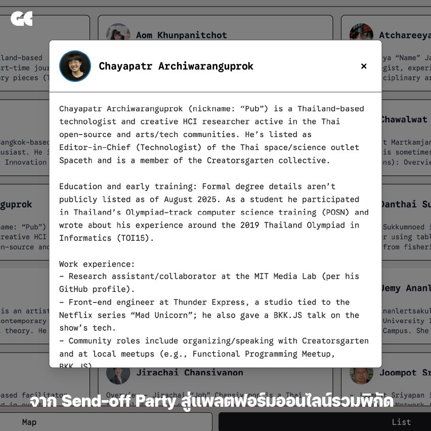 หลังจากทำงานอย่างต่อเนื่องกับบั๊กมากมายที่โผล่มาไม่หยุดจนหยดสุดท้าย ในที่สุด ‘Connection Atlas’ ก็เปิดตัวในงาน TEDxBangkok 2025 ได้อย่างราบรื่น และถือว่าเป็นจุดคนแน่นที่ใคร ๆ ต่างก็เข้ามาเล่นสนุกกับแพลตฟอร์ม โครงการนี้จึงเป็นตัวอย่างที่ชัดเจนของการนำเทคโนโลยีมาสร้าง ‘พื้นที่แห่งการเชื่อมโยง’ ในยุคดิจิทัล ที่ไม่เพียงจับคู่คนจากข้อมูล แต่ยังปลุกให้เกิดการพูดคุย ความเข้าใจ และมิตรภาพที่เริ่มต้นจากจุดเล็ก ๆ บนแผนที่เดียวกัน