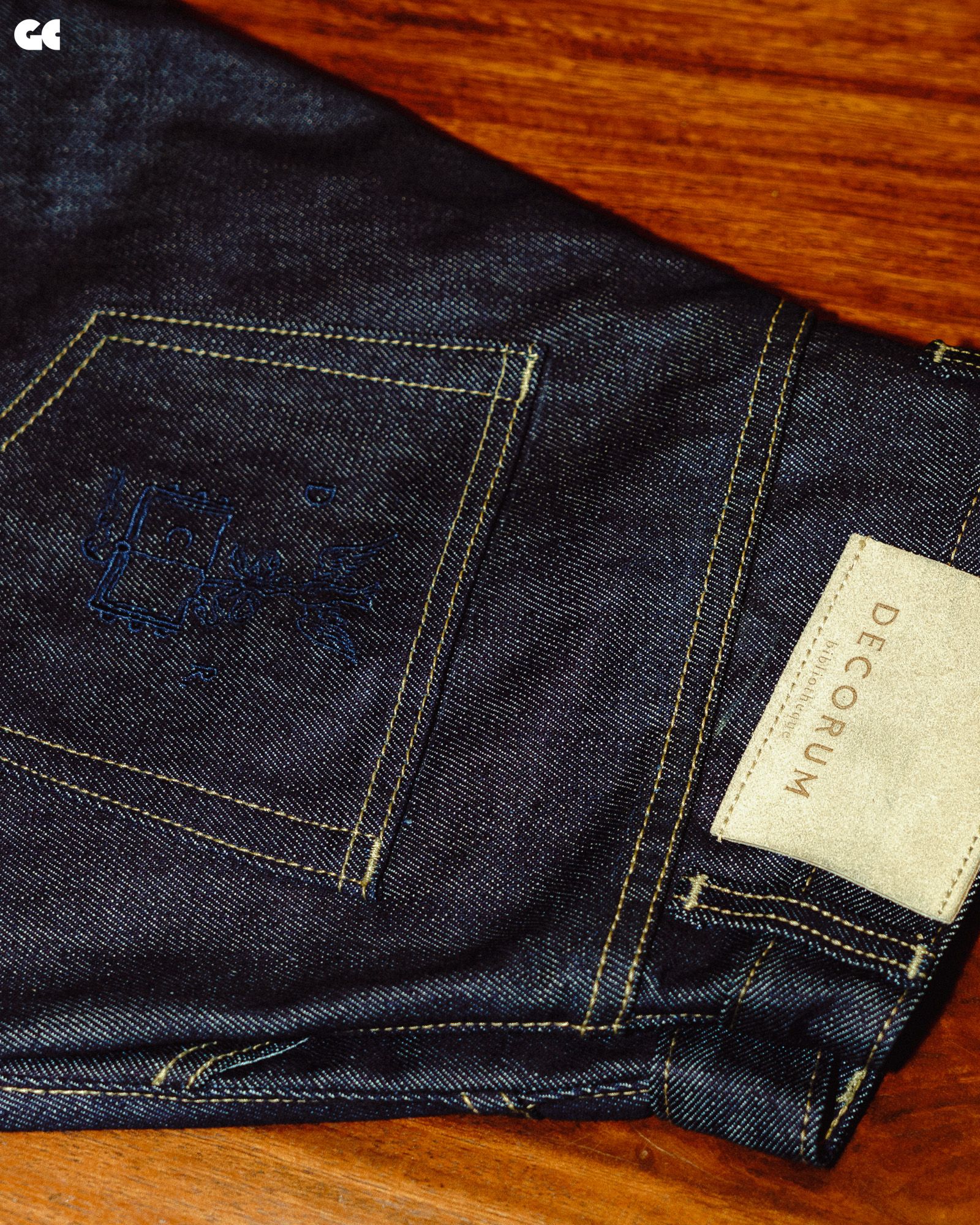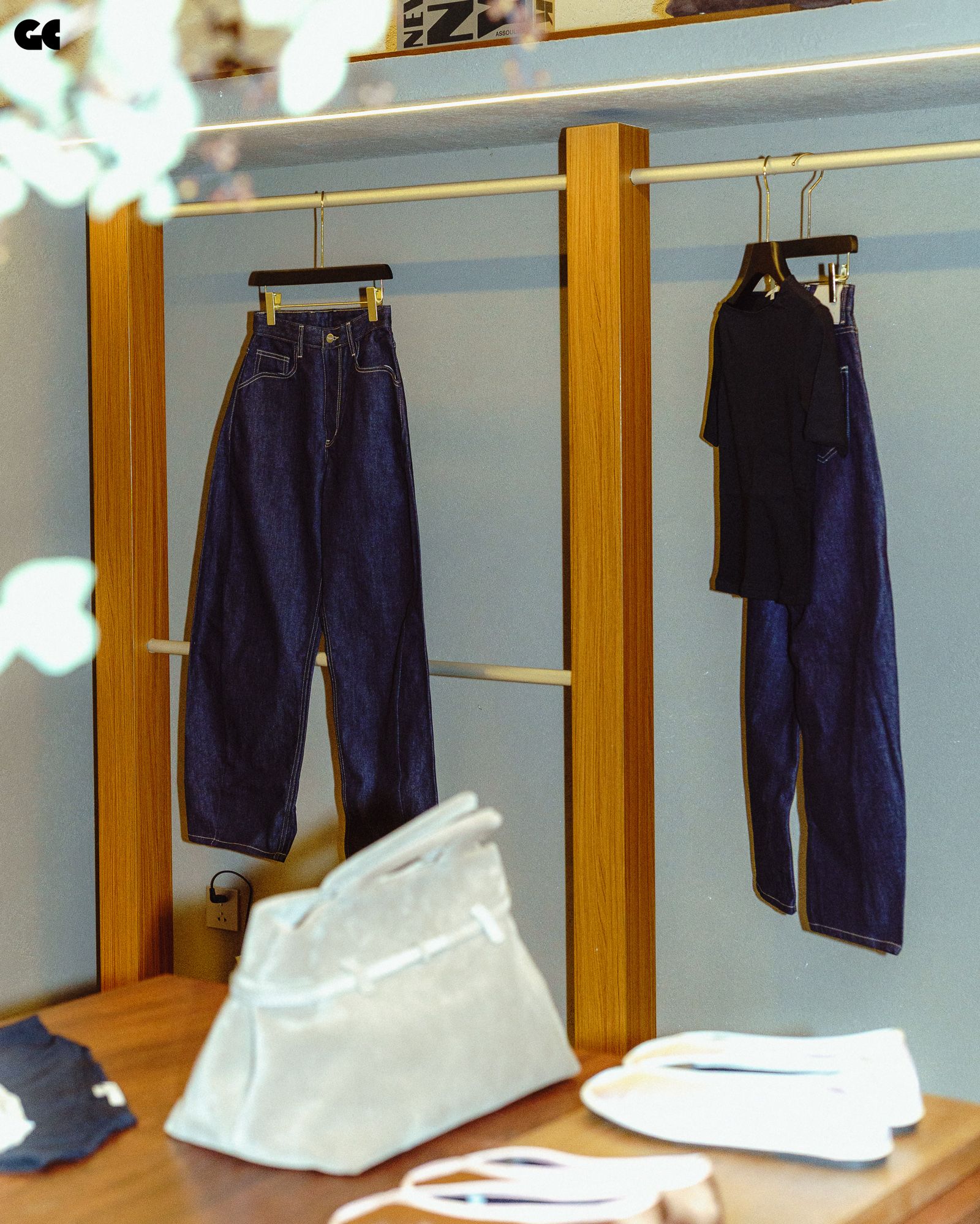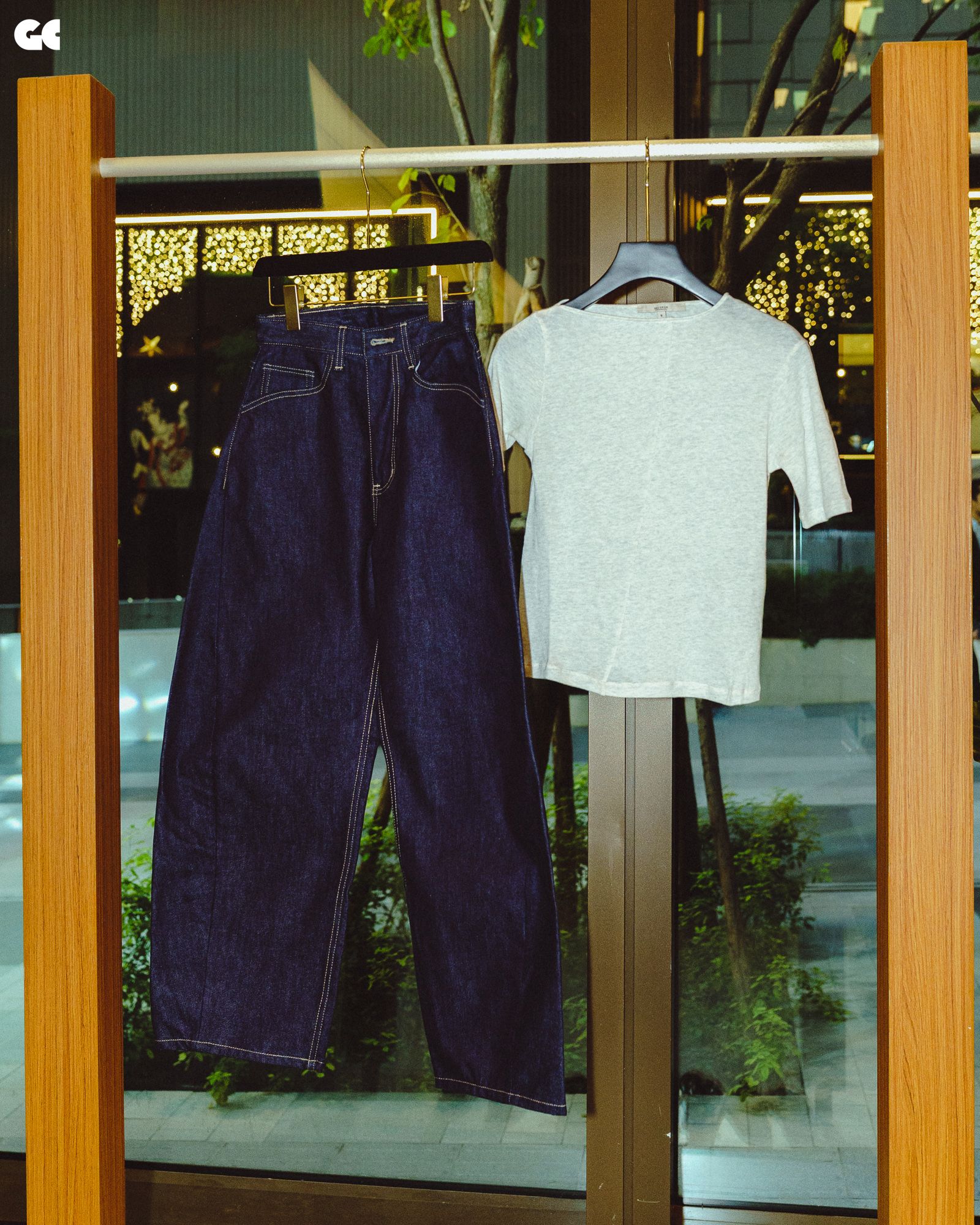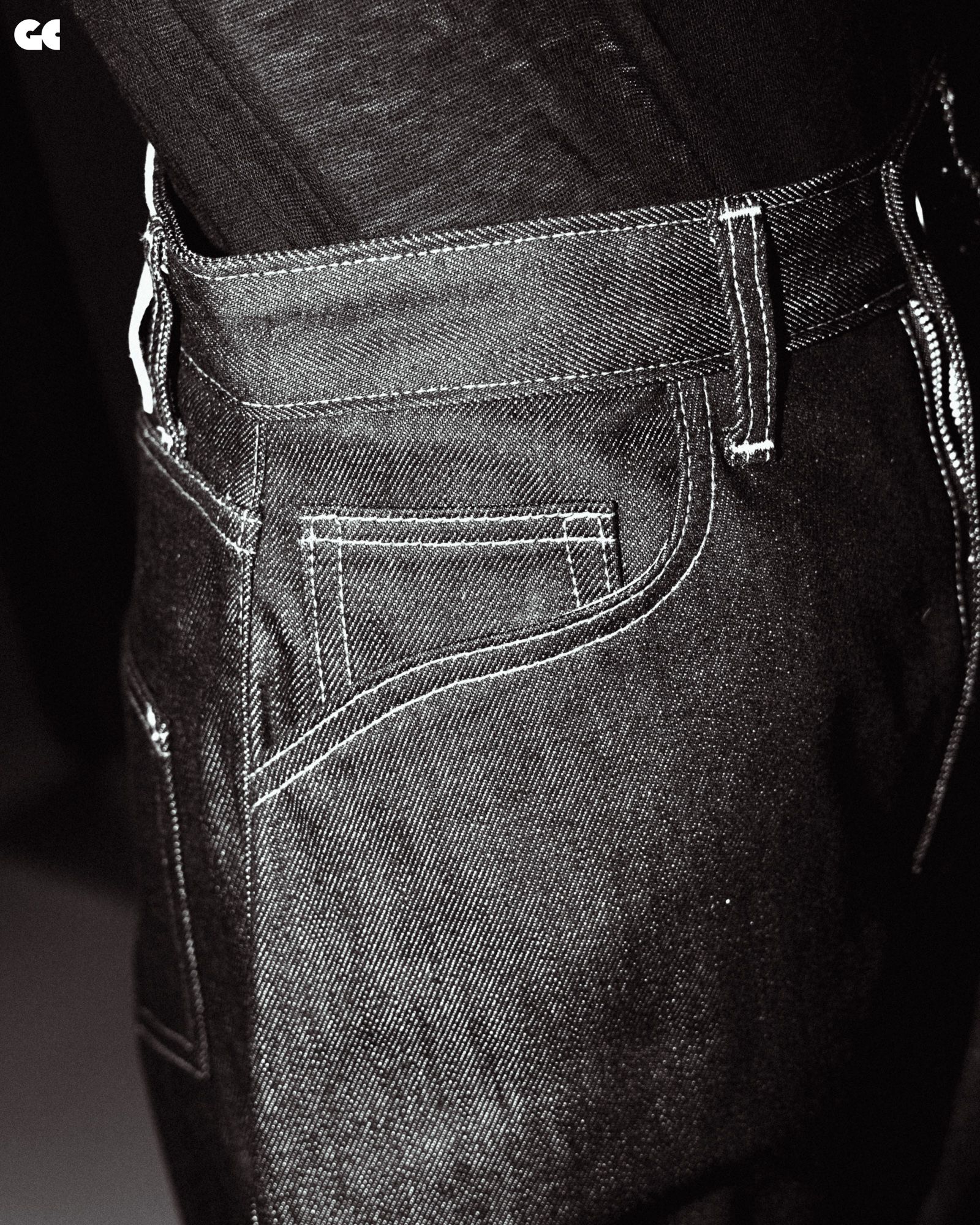 ส่วนกางเกงยีนส์ทรง Barrel สีเข้ม ใช้ผ้าเดนิมจาก Kaihara ประเทศญี่ปุ่น ที่มีจุดเด่นคือยิ่งเฟดยิ่งสวย ยิ่งเก่ายิ่งเท่ ส่วนดีเทลการตัดเย็นทางแบรนด์เลือกวิธีโชว์ตะเข็บกางเกงมาเป็นด้านหน้าแทนด้านข้าง เพื่อโชว์ให้เห็นมิติของการเคลื่อนไหวตอนสวมใส่ ช่วยเพิ่มลูกเล่นและมิติในการใส่กางเกงยีนส์ได้ดีมาก ๆ