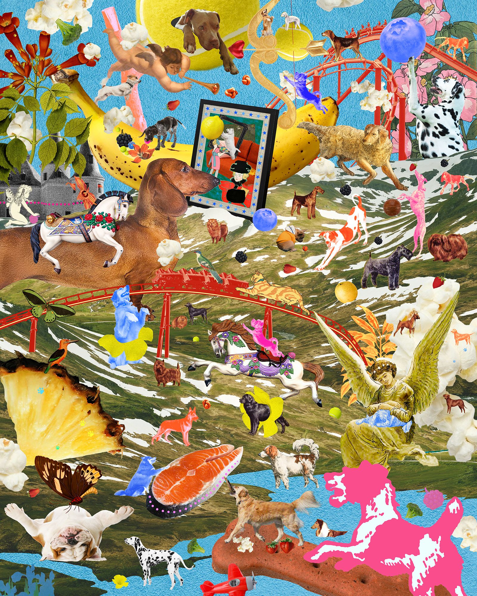 ในช่วงแรกของการทำ ยังไม่ได้มีภาพในหัวที่ชัดเจนว่ารายละเอียดในภาพควรจะมีอะไรบ้าง มีเพียงภาพรวมว่าอยากให้น้องหมาในงานมีความสุข สนุก และสดใส จนกระทั่งออกแบบไปได้สักระยะ และเริ่มเห็นภาพรวมของงานชัดขึ้น คอนเซ็ปต์ของภาพจึงตกผลึกออกมาเป็น ‘ดาวหมา’ สถานที่ในจินตนาการที่เราอยากให้พวกเขามีความสุข มีเพื่อน ไม่เหงา และยังแอบคิดถึงเราอยู่บ้าง
