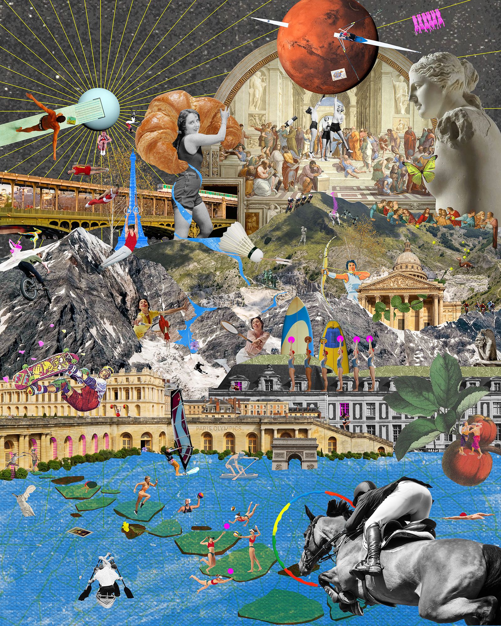ภาพนี้เป็นงานคอลลาจแบบเต็มรูปแบบชิ้นแรกของมี้เลยค่ะ ซึ่งตรงกับตอนที่ Olympic Games Paris 2024 กำลังจัดขึ้นพอดี และก็เป็นช่วงเดียวกับที่มี้กำลังว่าง เพราะรอเริ่มงานใหม่อยู่ด้วย ด้วยความที่เรียนจบสถาปัตยกรรมมา มี้เลยอินกับพิธีเปิดโอลิมปิกปีนี้เป็นพิเศษ การนำพื้นที่ของเมืองและสิ่งปลูกสร้างจริงมาใช้เป็นส่วนหนึ่งของพิธีเปิด เป็นสิ่งที่ทำให้รู้สึกตื่นตาตื่นใจมาก มี้จึงอยากถ่ายทอดภาพของโอลิมปิกที่ปารีส ซึ่งเราเห็นผ่านหน้าจอ ออกมาในมุมมองที่ตัวเองสนใจ ผ่านงานคอลลาจชิ้นนี้