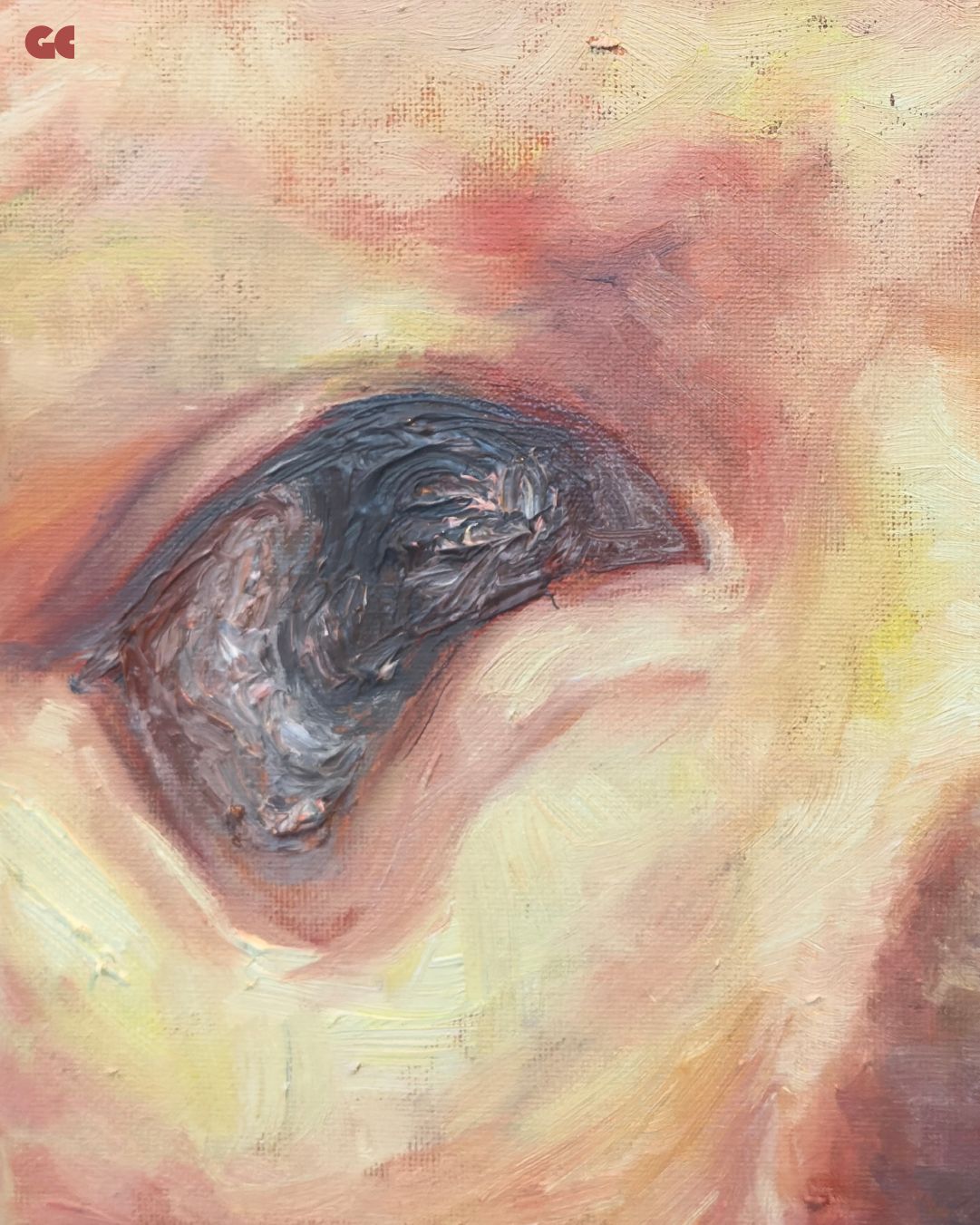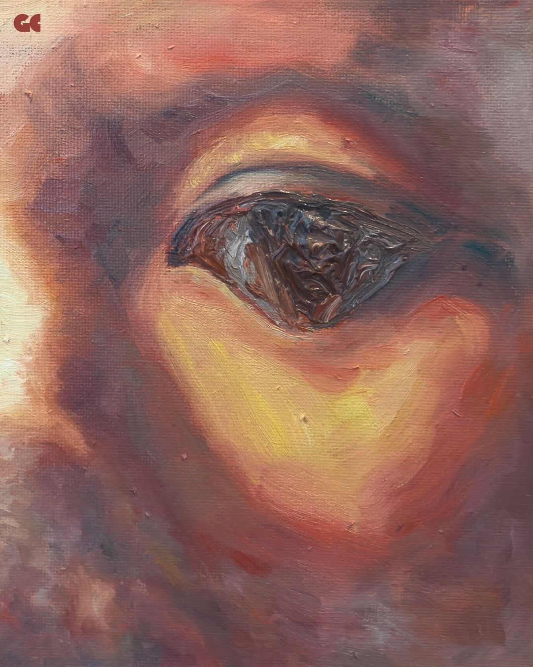 แต่ดวงตาในภาพนี้เราได้แรงบันดาลใจมาจากตาของตัวเองเลยค่ะ เพราะในตาขาวเรามีไฝอยู่ ตอนเด็กเราชอบเล่นมุกกับเพื่อนว่า “นี่ เรามีตาดำสองอันนะ” แล้วก็แหวกให้ดู 😅 วันหนึ่งเรานั่งมองจุดนั้นแล้วอยู่ ๆ ก็รู้สึกว่า เออ…มันก็เหมือนพาร์ต Shadow ของเรานะ เหมือนตัวตนอีกด้านที่ซ่อนอยู่ข้างใน เป็นมุม negative ที่เราไม่ค่อยยอมรับหรือไม่อยากเห็น