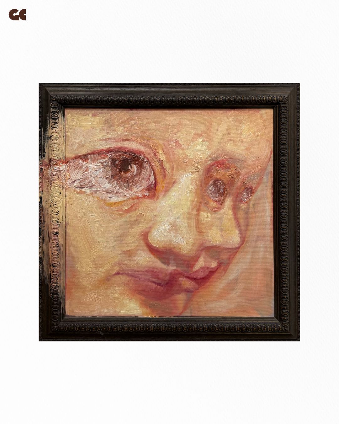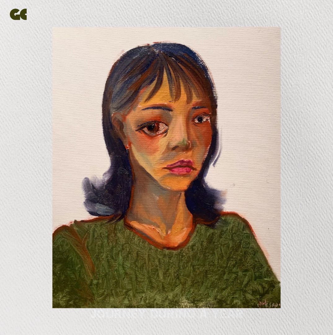 “ภาพนี้มีความหมายกับเรามาก เพราะเป็นภาพแรกที่เราได้หยิบพู่กันขึ้นมาใช้สีน้ำมันจริง ๆ ตอนนั้นเพิ่งกลับมาวาดรูปได้ไม่นาน ใช้เวลาส่วนใหญ่ไปกับการนั่งแอบสเก็ตช์ผู้คนตามที่ต่าง ๆ เลยยังไม่ได้วาดอะไรจริงจังนัก วันหนึ่งเราไปเชียงใหม่ แล้วมีโอกาสได้วาดรูปกับศิลปินต่างชาติคนหนึ่ง แต่ตอนนั้นไม่รู้จะวาดอะไรดี ก็เลยหยิบโทรศัพท์ขึ้นมาตั้งกล้องหน้า ตั้งใจว่าจะลองวาดตัวเองแบบจริงจังดู เพราะก่อนหน้านี้เรามักจะวาดแค่สเก็ตช์เร็ว ๆ”