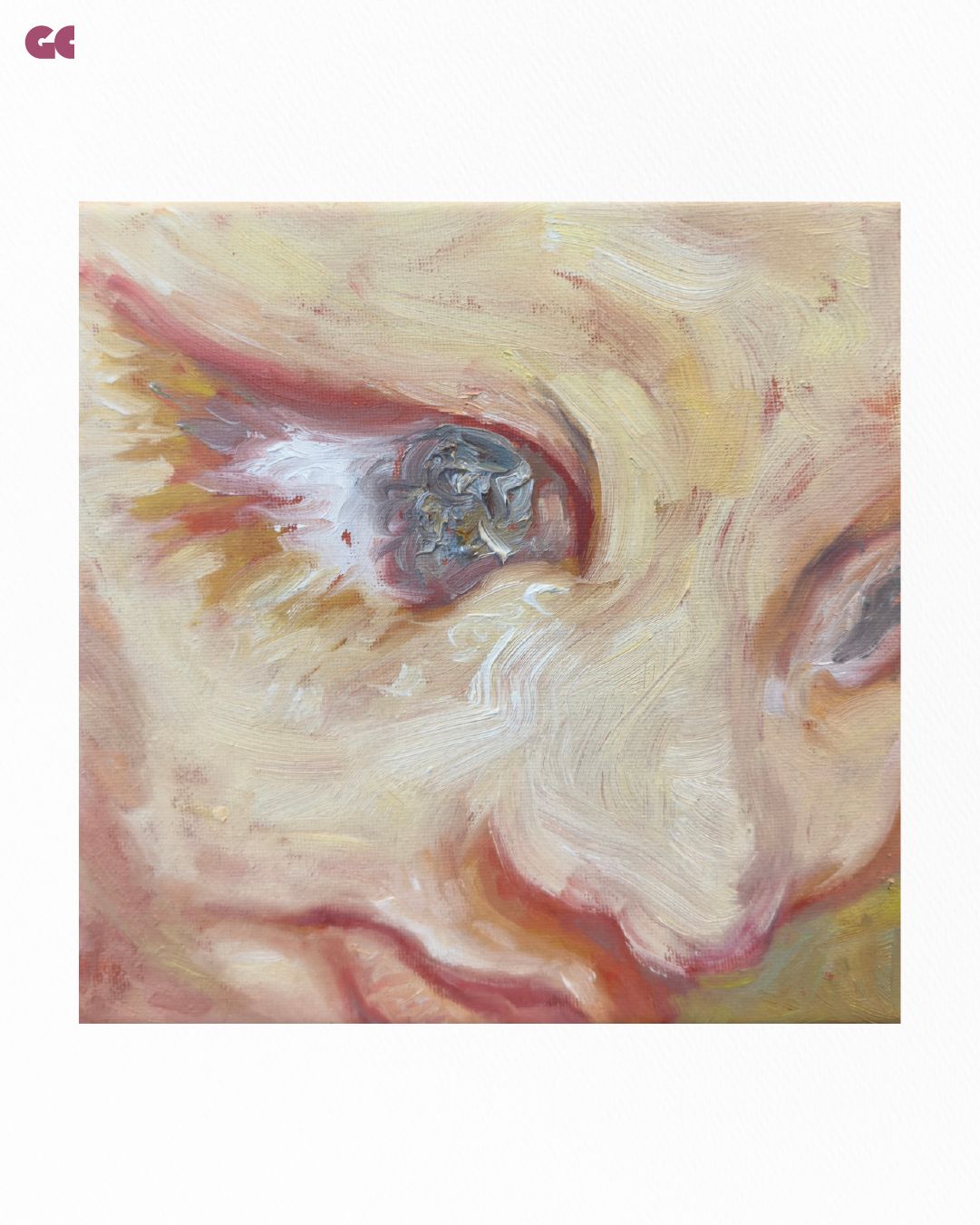 “รูปเซตนี้มาจากคอลเลกชัน The Self & The Shadow ที่เรากำลังอินมากในช่วงนี้ ถ้าให้อธิบายง่าย ๆ ก็คงเหมือน ‘Angel & Devil’ ที่อยู่ในหัวเรานั่นแหละค่ะ อย่างภาพ ‘ตา’ ภาพนี้ ปกติเราชอบวาดตาอยู่แล้ว เพราะมันเป็นส่วนที่เราได้ละเลงทั้งสีและความรู้สึกลงไปเต็มที่