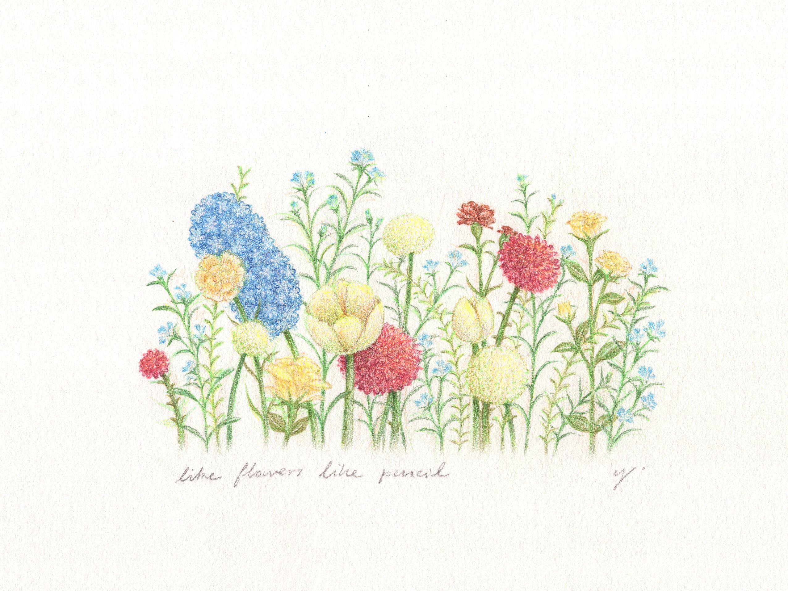 เมื่อปี 2022 เราได้ไปเรียนจัดดอกไม้ครั้งแรก ครูที่สอนเราเล่าให้ฟังว่า ถึงแม้ดอกไม้จะเหมือนกัน แต่คนจัดเป็นคนละคนมันก็ออกมาต่างกันนะ แม้กระทั่งคนจัดเป็นคนเดียวกันแต่กลับมาจัดอีกรอบก็อาจจะไม่เหมือนเดิม ตอนนั้นเราคิดขึ้นในใจว่า การจัดดอกไม้นี่เหมือนการวาดภาพเลยเนอะ แค่ใช้แจกันแทนกระดาษ ใช้ดอกไม้แทนสีไม้ รูปแบบแพทเทิร์นก็ไม่ต่างกับลายเส้นที่แต่ละคนใช้ ตอนร่างเราใช้วิธีคิดเหมือนกับตอนจัดดอกไม้จริง ๆ ภาพนี้เลยเป็นเหมือนการเอาดอกไม้ในแจกันเดิมออกมาจัดใหม่แต่เป็นในกระดาษ