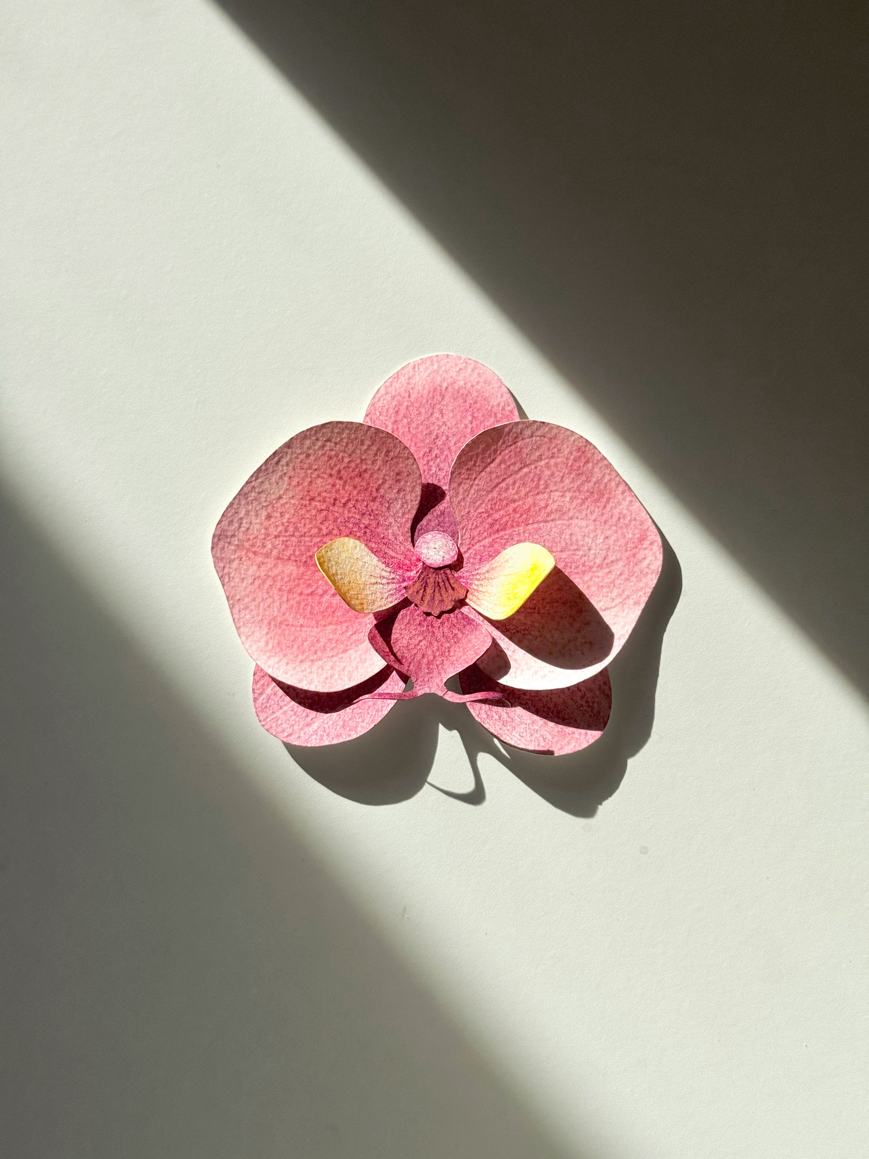 ชิ้นนี้ไม่ได้ตั้งชื่อไว้เพราะเป็นหนึ่งใน experiments ก่อนที่เราจะมาเริ่มโปรเจกต์ Orchids Journal เป็นงานกระดาษที่ผสมหลายเทคนิคเข้าด้วยกัน สีน้ำ สีไม้ การตัดแปะ การสร้างพื้นผิวที่นูนและจม รวมไปถึงการดัดกระดาษให้โค้งงอเป็นรูปทรงคล้ายกลีบดอกไม้ ชอบชิ้นนี้เพราะว่าชอบตอนตัวเองสงสัยว่า เอ๊ะ ทำไมที่วาดไว้ตอนแรกมันใช้ไม่ได้ ลองตัดตรงนี้ดูดีไหมนะ ถ้าเอาส่วนนี้มาทับกันก่อนจะเป็นยังไง พูดง่าย ๆ คือเราชอบกระบวนการตอนทำมันขึ้นมาค่ะ