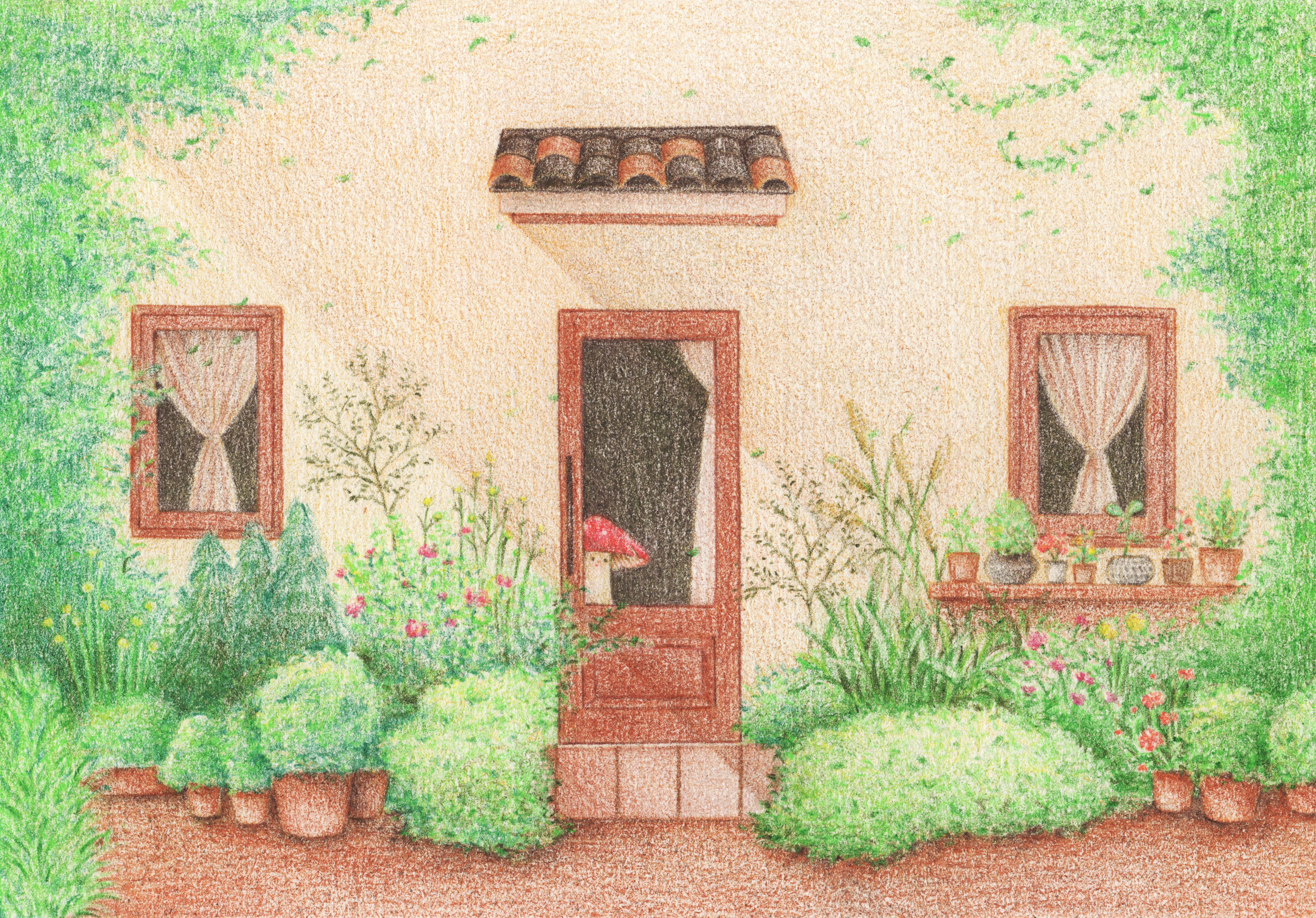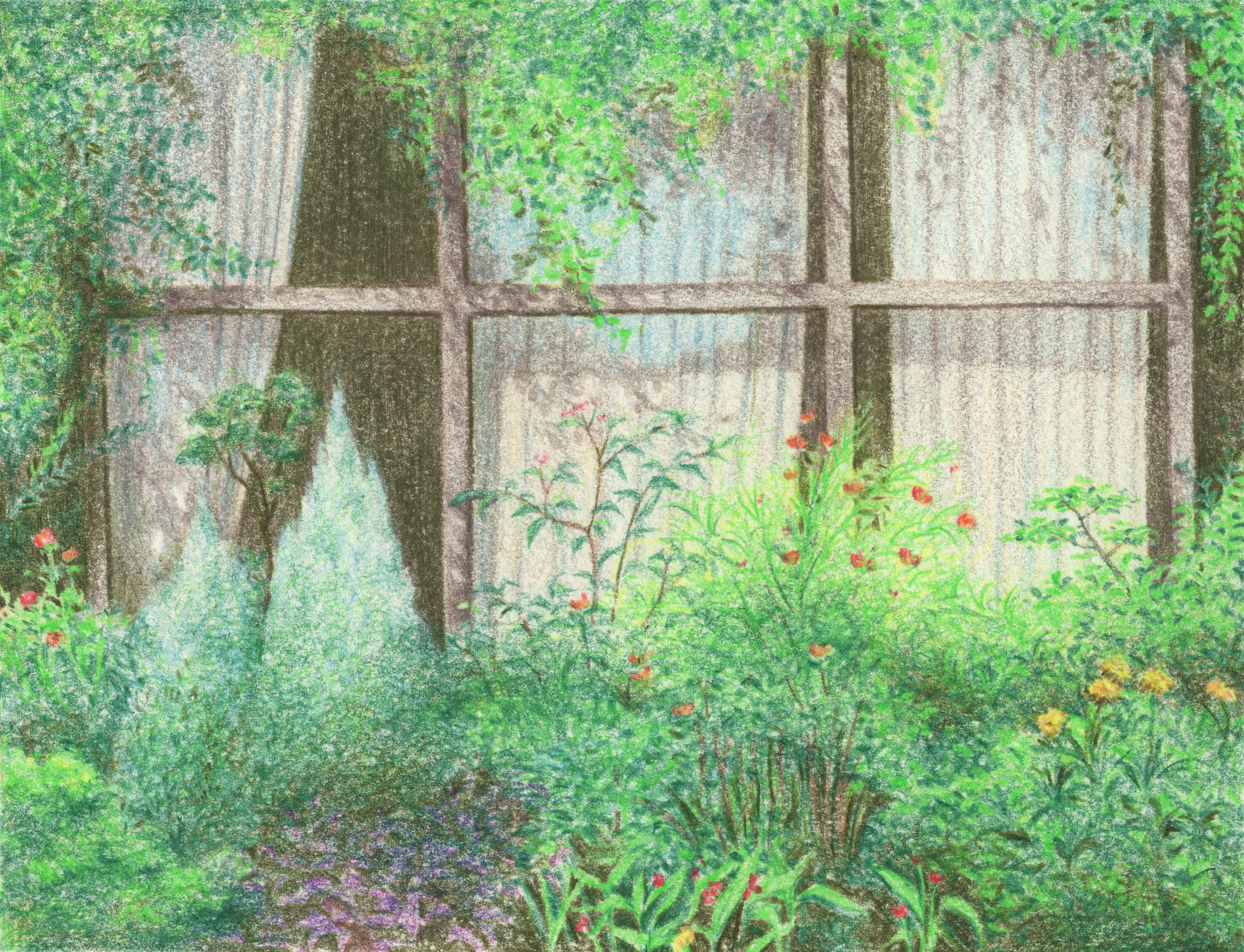 เป็นภาพที่ชอบมาก ๆ ภาพหนึ่งเลยเพราะว่ามันเป็นการวาดฉากครั้งแรก ๆ เราไม่เคยคิดว่าเราจะทำมันได้ แต่เราก็ทำมันได้แล้วจริง ๆ แรงบันดาลใจมาจากความรู้สึกตอนที่เรามองเข้าไปยังต้นไม้และดอกไม้ เช้าวันนั้นแดดยังไม่จัดมาก มีลมเย็น ๆ มีเสียงนกร้อง มีน้องหมาวิ่งเล่นอยู่ใกล้ ๆ เราแค่ชอบบรรยากาศที่เห็นในตอนนั้นมากเลยเอากลับมาวาดค่ะ